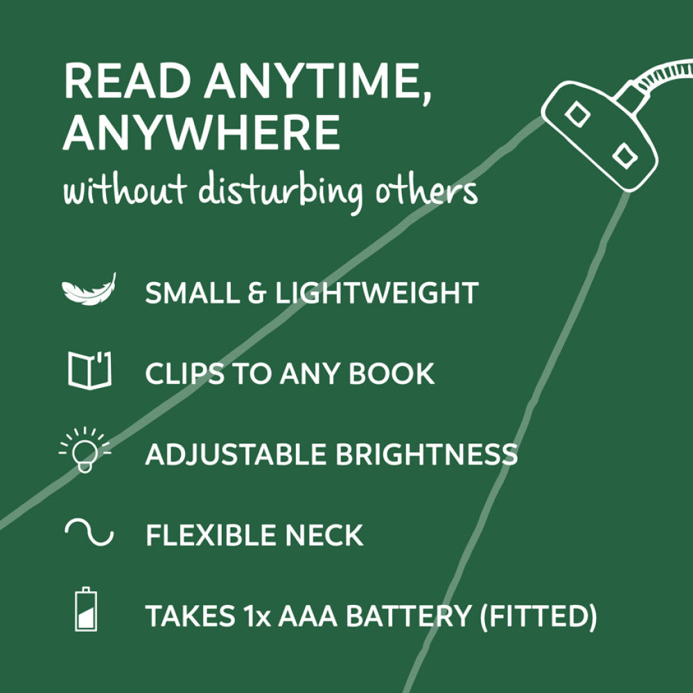 A handy clip-on reading light, small and lightweight enough to slip inside your bag or pocket. Carry on reading anywhere, even when the sun goes down. Perfectly travel practical for a relaxing holiday or simply on the commute home. And it takes a standard AAA battery - easy to find and change wherever you are! The Really Serious Book Light Range is a co-ordinated collection of reading lights designed to suit the needs of all kinds of book light users.